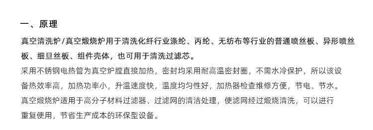 產(chǎn)品概述:真空清洗爐/真空煅燒爐用于清洗化纖行業(yè)滌綸、丙綸、無(wú)紡布等行業(yè)的普通噴絲板、異形噴絲板、細(xì)旦絲板、組件殼體,也可用于清洗過(guò)濾芯。真空清洗爐/真空煅燒爐采用不銹鋼電熱管為真空爐膛直接加熱,密封均采用耐高溫密封圈,不需水冷保護(hù),所以該設(shè)備熱效率高,加熱功率小…