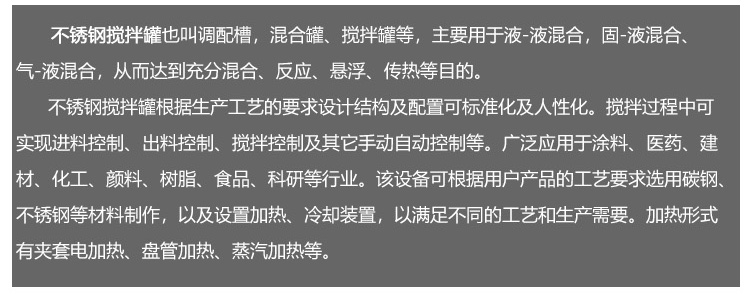 產(chǎn)品概述:不銹鋼液體攪拌罐也叫調(diào)配槽、混合罐、攪拌罐等,主要用于液-液混合,固-液混合、氣-液混合,從而達到充分混合、反應(yīng)、懸浮、傳熱等目的。不銹鋼攪拌罐根據(jù)生產(chǎn)工藝的要求設(shè)計結(jié)構(gòu)及配置可標準化及人性化。攪拌過程中可實現(xiàn)進料控制、出料控制、攪拌控制及其它手動自動控…